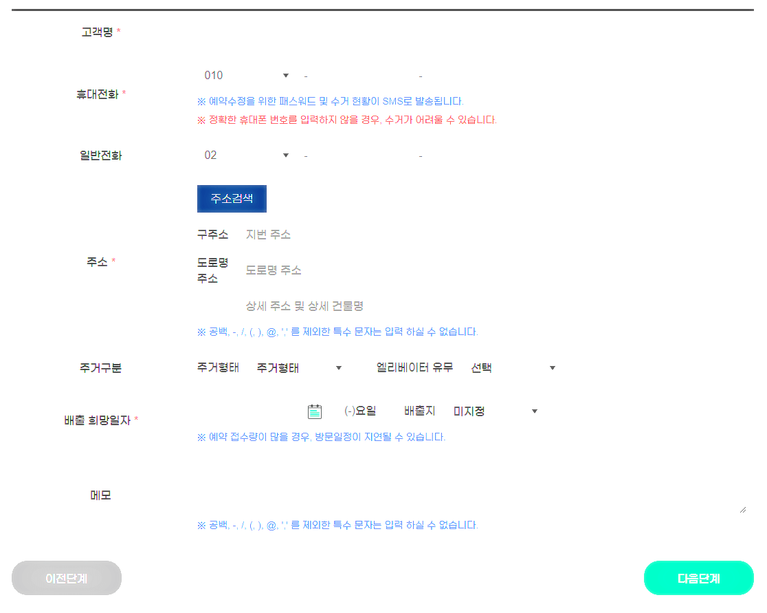 이용약관 동의 체크-고객 기본정보 입력-배출 희망일자-배출할 가전제품 선택-예약 정보 최종 확인으로 신청을 완료할 수 있습니다. 본인이 예약한 내용을 반드시 확인해 주시는 것이 실수를 줄일 수 있는 방법이니 지정한 날짜에 예약한 폐가전을 서비스 기사에게 전달해 주시면 되겠습니다.